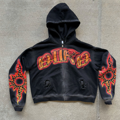 Custom Hiphop Streetwear Vintage Acid Wash Hoodies French Terry Zip Up Hoodies Screen Printing Rhinestone Men's Cropped Hoodie